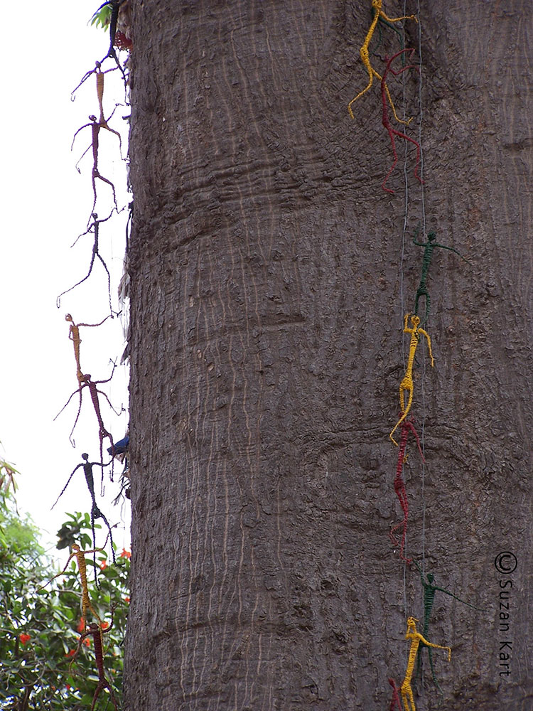 • les lignes continues de personnages en fil de fer qu’il a peints en vert/jaune/rouge et disposés dans un mouvement ascendant. Ils représentent une des nombreuses mises en scène de la phrase de Nietzsche qui hante Ndary Lo, « Monter c’est ce que veut la vie et en montant se dépasser ». Il développera cette scénographie et une multitude de ses figurines seront les uniques personnages de la très émouvante installation Recours / 2004,
