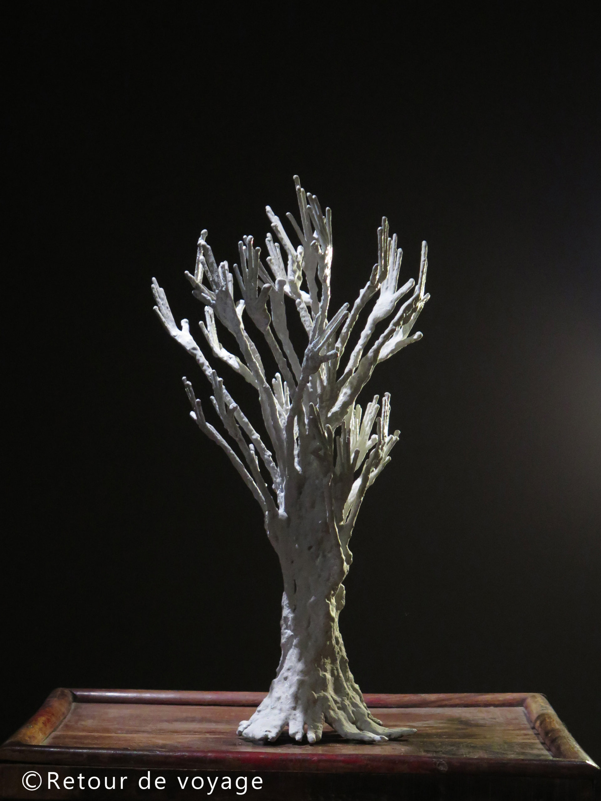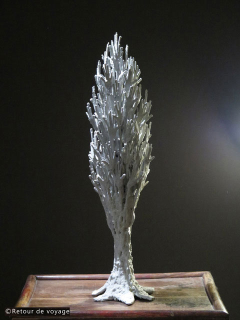 Puis le concept s’est sophistiqué pour devenir dix ans après les arbres de la Muraille Verte où le tronc des arbres est un corps de femme, la terre qui porte des groupes d’hommes les mains dressées vers le ciel dans un message d’espoir.